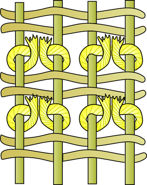 To make a Turkish knot, the yarn is passed between two adjacent warps, brought back under one, wrapped around both forming a collar, then pulled through the center so that both ends emerge between the warps.